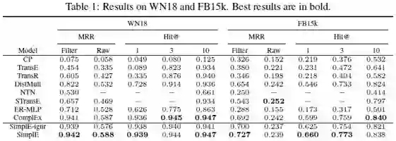 作者与WN18和FB15K在两个基准数据集上进行了比较,结果显示了SimplE都取得了较好的效果。
