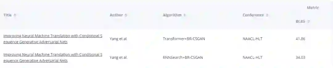 此外,算法描述也能提供一个简要的理解。例如在机器翻译中的 NIST05 (Chinese-English) 数据集上,当前最优的论文可以视为结合了 Transformer 与 CSGAN。算法简述与其所投的的大会能让我们在最短的时间内对该论文有一个直观了解: