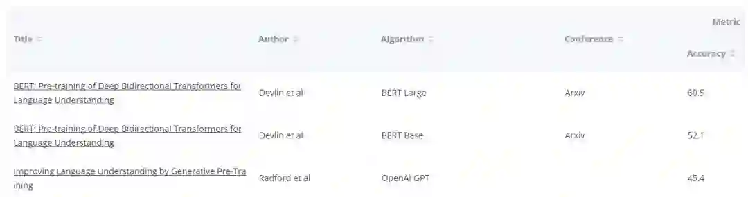尽管目前已经有很多诸如 arxiv-sanity、GroundAI、Deep Learning Monitor、reddit、Medium 等等能帮助我们紧跟 AI 和 ML 领域最新发展的网站。作者认为目前我们尚未拥有易于查询的项目来检索最先进的、可量化的任务结果。遵循这个想法,作者的目标是建立这个工具,不仅对研究人员有用,对任何想要咨询或有助于推动该领域的人都有用。