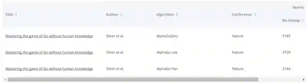 当然,这里收录的 SOTA 结果也不全包含最新的。比如,依次点击「Game Playing」、「Abstract-Strategy」、「Go」之后,你将看到如下结果: