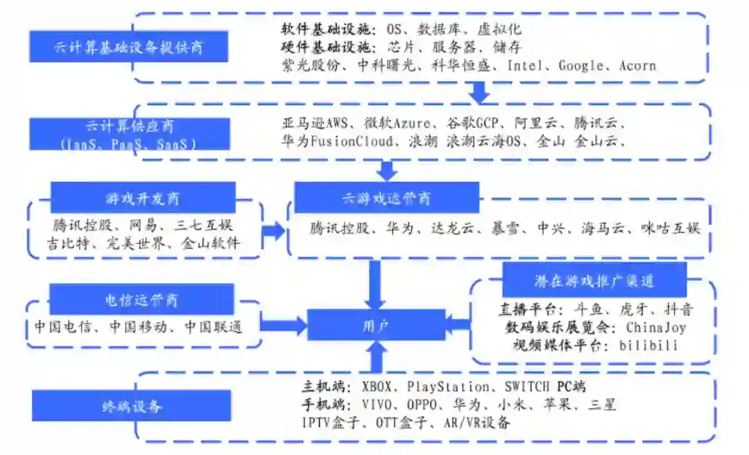 从 2G 时代到 4G 时代,游戏行业逐步迎来了街机游戏,主机游戏,端游、页游、手游的成熟。而移动互联网的发展让手游逐步替代页游和端游,成为游戏行业的主导。5G来临,云游戏有望打破现在强势发行方的游戏格局,优质CP享受强议价,即点即玩简化买量转化步骤,提高买量转化率,供给端节约买量成本。