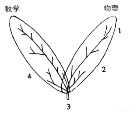 20 世纪物理学的发展使物理学家逐渐认识到,离开数学的支撑,物理学将举步维艰、寸步难行。另一方面,理论物理学家研究最基本的、最原始问题时取得的突破性研究成果,往往包含对数学发展有建设意义的、有启发作用的思想方法。杨振宁对此深有体会,数学与物理学二者的关系成为长期萦绕在他思想中的一个问题。从美学的角度,杨振宁认为:“物理学——当然包括理论物理学——中的许多美是与数学中的美的观念紧密相关的。”[1] 但就具体内容而言,他更强调二者之间大异小同的事实。1979 年他对此作了较为明确的描述。[2]在他看来,数学和物理学之间,除了有若干共同的最基本的概念外,一致性的东西不多;二者之间更多的是不同:目标取向不同、情感好恶不同、研究传统不同、价值观念不同、主体内容不同。深入辨析和体会不难发现,杨振宁所说的数学与物理的诸多不同,有些实质所指是数学家与物理学家之间的差异,比如不同的情感好恶等。在此之后杨振宁为进一步形象地表达他的这一认识,描绘出著名的双叶图。1980年1月在香港大学的演讲中,杨振宁借助双叶图,再次阐述他关于数理关系的观点:“在基本概念的水平上,它们令人惊异地共同使用某些概念,但即使在这里,每一方面的生命力是沿着各自的脉络奔流的(见图 1)。”[3] 据本文作者的初步了解,这是杨振宁第一次用双叶图阐释数理关系。