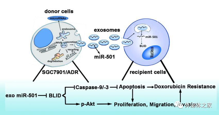 MicroRNA-501-5p(miR-501)是最新被发现的致癌miRNA。一些研究报道miR-501在肝细胞癌(HCC)、肺腺癌、宫颈癌和胃癌组织中高表达。miR-501的高表达促进肺腺癌和宫颈癌的进展,并预测胃癌的预后不良。研究团队在此之前发现,miR-501通过靶向BH3样基序蛋白(BLID)来增强胃癌对多柔比星的耐药性以及胃癌的肿瘤发生。在这项研究中,miR-501在多柔比星耐药的胃癌细胞系SGC7901/ADR细胞分泌的外泌体(ADR Exo)中比在敏感SGC7901细胞分泌的外泌体(7901 Exo)中表达要高。ADR Exo被SGC7901摄取时,Cy3标记的miR-501可以通过外泌体从SGC7901 / ADR细胞转移至SGC7901细胞。ADR Exo增强了胃癌细胞对多柔比星的耐药性、增殖能力、迁移和侵袭能力,并抑制细胞凋亡。 敲低miR-501或过表达BLID可以逆转ADRExo对受体细胞的不良影响。用外泌体抑制剂GW4869处理与SGC7901/ ADR共培养的SGC7901细胞,或者在细胞中转染miR-501抑制剂,可以使细胞恢复对多柔比星的敏感性并且表现出增殖、迁移和侵袭能力减弱以及细胞凋亡增加。与miR-501敲低或BLID过表达的细胞相比,瘤内注射ADR Exo至对照组SGC7901细胞后,皮下肿瘤生长速度加快并且出现对多柔比星的耐药性。综上所述,这些效应可能通过外泌体miR-501诱导的BLID下调,随后通过caspase-9 / -3的失活和Akt的磷酸化激活来实现的。因此研究人员认为,外泌体miR-501可能是胃癌的新的治疗靶点。