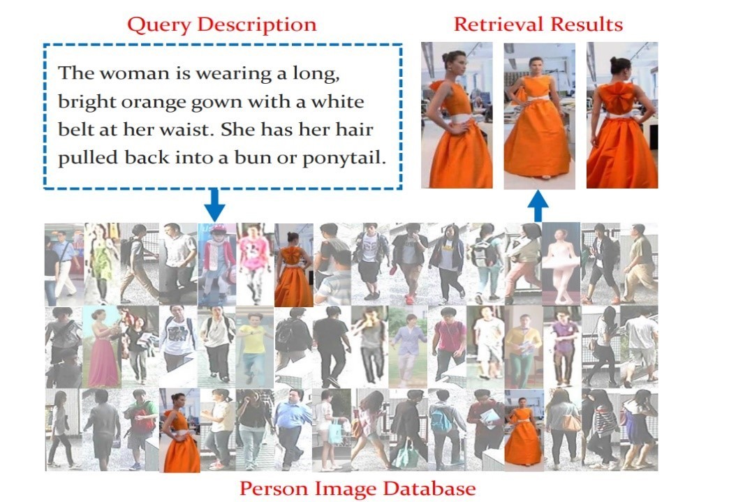 大规模图像库检索有非常大的行业意义,通常提取图像属性特征再通过属性检索来找到目标。但是常用场景比如嫌疑犯描述都是通过自然语言描述(人类能理解的语言)。本论文提出了使用自然语言描述进行人的大库检索,如上图所示,自然语言描述为「这位妇女穿着一件长而亮的橙色长袍,腰上系着一条白色腰带。她把头发挽成一个发髻或马尾辫。」这样的描述要比用属性来的丰富的多。这个系统定位人体图像显著视觉区域,同时把有意义的文本描述短语赋予显著的视觉区域。通过学习图像-语言关系,系统可以准确得到自然语言查询和相似度得分,从而大大提成查询准确率和效率。