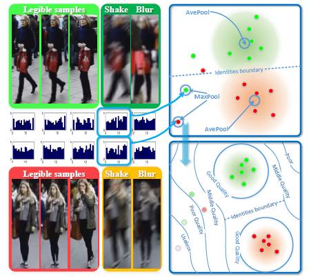 在人脸识别、人体再识别任务中,输入的数据通常是每张人脸或每个人体的多张图像构成的序列。现有的方法利用卷积神经网络对一个序列中的所有图像分别提取特征,再将特征进行简单的平均或池化,作为该序列的最终特征用于之后的识别。但实际应用场景中一个序列中的图像可能在许多方面存在着较大差异,例如光照、清晰度、角度等,如示例图。由于在融合序列的特征时没有考虑到这些差异,上述方法在实际应用场景用会受这些因素的影响从而无法达到理想的效果。本论文提出了一种新的序列匹配方法,充分考虑了序列内图像的差异性,并利用深度学习的方法对这种差异性进行无监督的学习,再根据学习到的质量差异性对序列中的图像特征进行融合,最终得到具有较高判别力的序列特征,解决光照模糊等一系列实际应用中的问题。