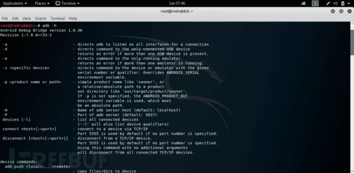现在,我们就可以在Android设备上执行不同的adb命令了。通过-h选项查看可用参数: