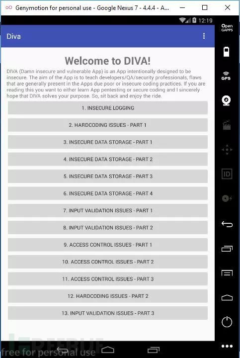 对于安卓应用的逆向,这里有一个非常好的可供我们学习和练习的apk - DIVA ( Damn insecure and vulnerable mobile Application )。这是一个由Payatu的安全分析师开发的脆弱安卓应用。下面我们也将以该应用为例: