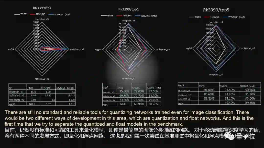 瑞芯微 RK3399开发板——该芯片在安防等领域有广泛应用,采用28nm工艺。结果显示,在浮点模型不需要定点化重新训练的情况下,int8计算以精度损失最大为1%的代价,达到了相对于浮点计算两倍的性能。
