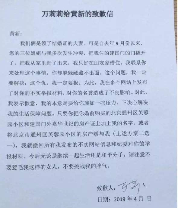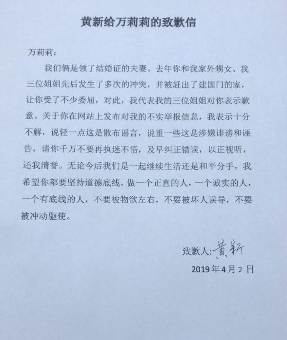 黄新给万莉莉的道歉信,图片来自黄新朋友圈