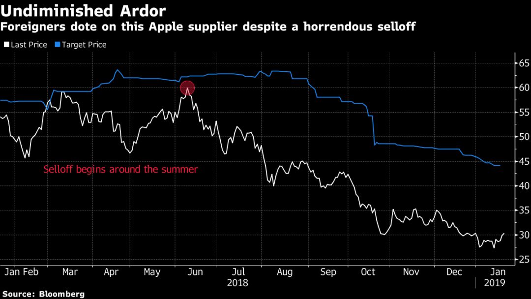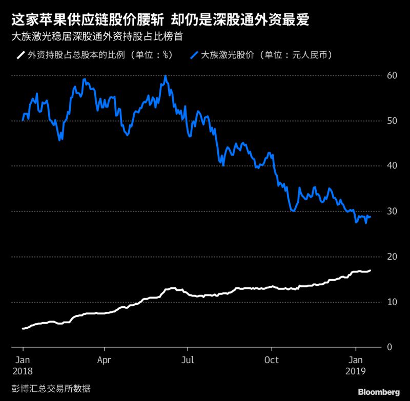 苹果概念股大族激光受iPhone销售疲软拖累,股价比2018年高点几乎腰斩。不少基金经理也萌生退意,但并不妨碍境外投资者对其青睐有加——2018年上半年就开始大举增持,下半年越跌越买,11月以来则稳定超越美的,成为深股通持股占比第一股。