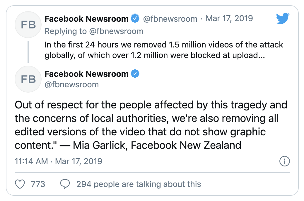 2019年,新西兰大规模枪击事件中,凶手惨无人道地用Facebook做直播。事件发生的24小时以内,平台不得不删除了150万个关于枪击案的视频,还受到了舆论的强烈指责。