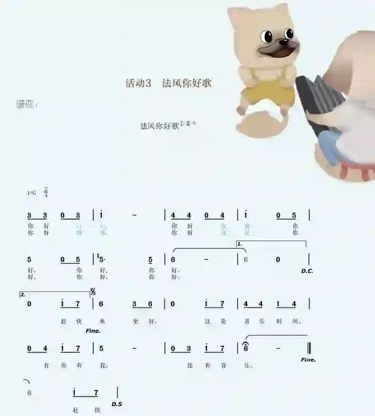 当你想教孩子怎样和小朋友们打招呼时,你可以教他唱《法风你好歌》:你好Lily,你好皮皮。你好你好你好……