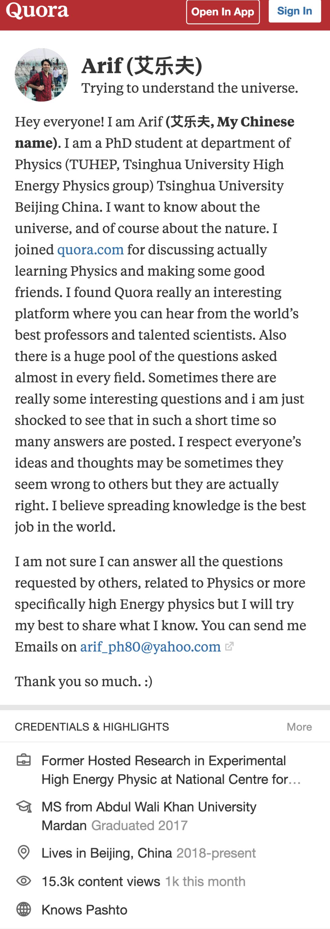如果你稍微去Quora一搜就会发现,这位同学在清华大学高能物理研究组读博士,爱好是探索宇宙和世界的本质,愿意回答任何相关的物理问题,根本和自媒体作者说的“在Reddit论坛上炫耀的洋垃圾“相差十万八千里。