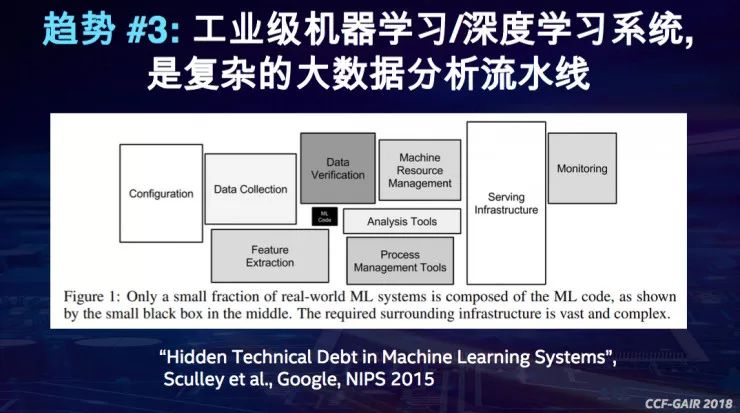 第三个趋势,深度学习的模型只是整个流程的一部分,要构建和应用深度学习模型,还有数据的导入、数据清洗、特征提取、对整个集群的资源的管理和各个应用之间对这个资源的共享等,这些工作事实上占据了机器学习或者深度学习这样一个工业级应用开发的大部分的时间和资源。所以,数据处理、机器学习,以及算法必须很好地和现有的大数据处理的工作流整合在一起。