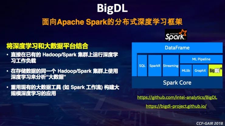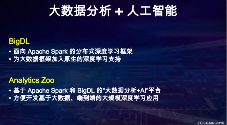 戴金权介绍了用户如何使用Analytics Zoo for BigDL在他们现有的大数据集群,通常是有非常大规模的至强的处理器上应用大数据的集群或者平台上,构建新的深度学习的应用。