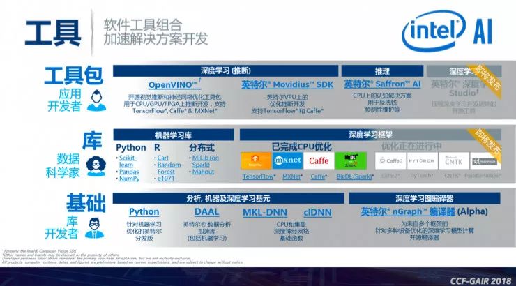 在基础层,有英特尔针对机器学习优化的英特尔发行版Python、优化的DAAL的发行版、MKL-DNN和clDNN神经网络函数的优化库、开源的nGraph编译器等;在库这一层,有机器学习库的优化、TensorFlow/MXNet/Caffe/BigDL等的优化,再到工具包这一层,有开源视觉推断和神经网络优化工具包OpenVINO、VPU上的优化推断开发的英特尔Movidius SDK、CPU上的认知解决方案英特尔Saffron AI。这些端到端的解决方案可以帮助开发者更快速地开发AI应用。