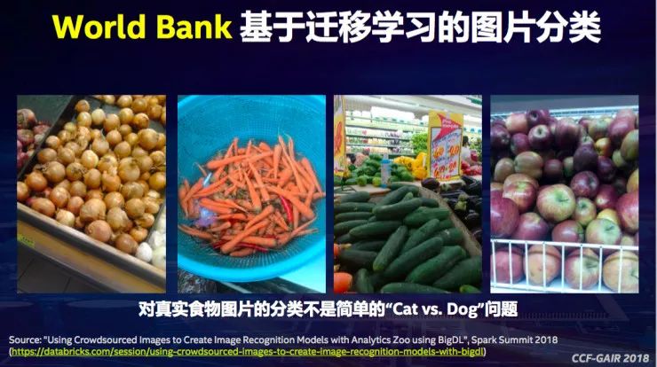 第三个案例是和世界银行在AWS上合作。世界银行通过志愿者上传的世界各地的食物图片,帮助大家来分析在世界各地的物价水平。其中如何通过大数据处理对图片进行清洗、处理,再用迁移学习来构建图片分类模型是值得关注的问题。