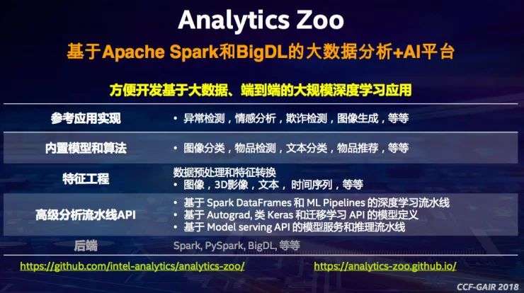 某种意义上它是Spark和BigDL的扩充,它的目的是方便用户开发基于大数据端到端学习的应用,除了内置的模型、内置的一些非常简单的操作之外,它里面还提供了大量的高级的流水线的支持,能够使用Spark DataFrames、ML Pipelines的深度学习流水线,能够通过迁移学习的API构建API模型的定义,在这个基础上就可以很方便地将我们提供的Model Zoo的模型甚至端到端的参考应用,比如说异常检测等等,可以通过非常少的代码,使用这些高级的API,并且使用内置的模型,很方便地就能将一个端到端的大数据分析加上深度学习的应用构建起来。