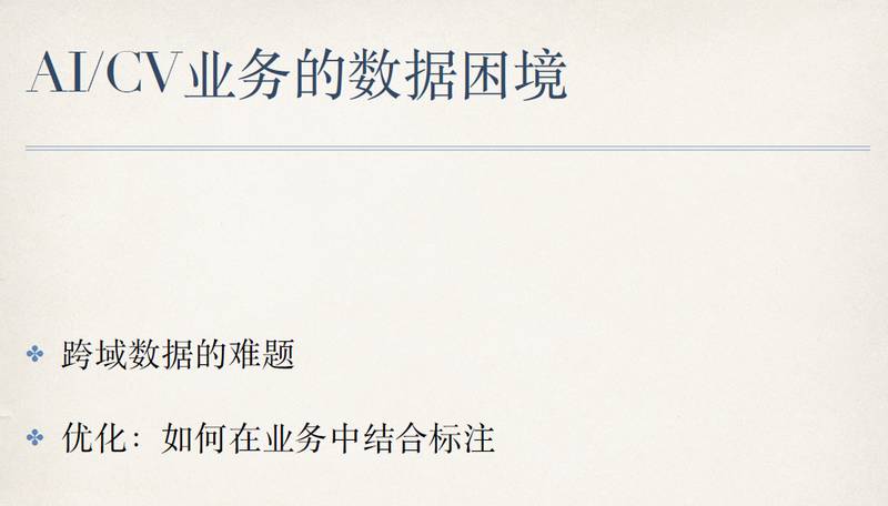 每个行业都有它自己不好做的地方,AI 这个细分行业里最大的特点就是数据依赖。大家可能都知道 AI 算法基本上都是以基于学习的算法为主,简单的讲就是通过大量的数据标注之后(Data),对一个网络(Network)的参数进行迭代优化得到一个模型(Model),业务层通过这个 Model 进行推理计算。我这个题目叫“如何开始一个 AI 业务”,当你在自己的业务上考虑这个问题的时候,你要用 AI 解决什么问题,首先要问自己数据够不够,第一是量够不够,第二是质量够不够,第三是数据的多样性够不够,量和质量比较好理解,下面讲一下多样性的问题,也就是跨域数据的难题。