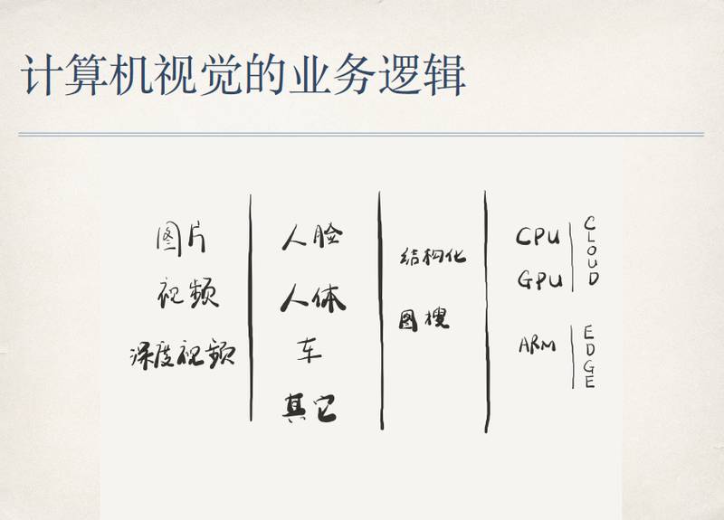另一方面就是越来越多地使用了 EDGE 端的计算,端到端(EDGE 端到 CLOUD 端)已经不再是什么秘密,一个很直接的结果就是降低了成本、提高了密度、以及广泛的智能化。举个例子,原来的 IPC(网络摄像机)都是传视频到后端去处理,现在很多专门的车辆及人脸抓拍摄像机可以在终端设备上把我们关注的对象抓拍成图片,再把图片传到后端去处理,一方面是节省带宽,原来一个 Gb 的带宽只能传输几十路视频,现在只传输抓拍图片可以做到万路,更令人激动的是,假如抓拍设备部署在普通的超市、饭店这样的街头小店里,使用非常便宜和普通的家用带宽就可以满足要求。另外一个好处是后端服务器的计算成本极大降低,可能降低两个数量级这样的程度。两个数量级大家可以想象是什么样的情况,我们可以把一个应用做到非常便宜,可以从原来 2G 的业务逐渐做到 2B 的业务,再逐渐做到 2C 的业务。目前零售行业以及一些智能办公行业已经在尝试这样的业务方式,总结一下,就是我经常在公司和客户那里说的三个词:低成本、高密度、智能化。这是从业务上来分析计算机视觉的一些情况。