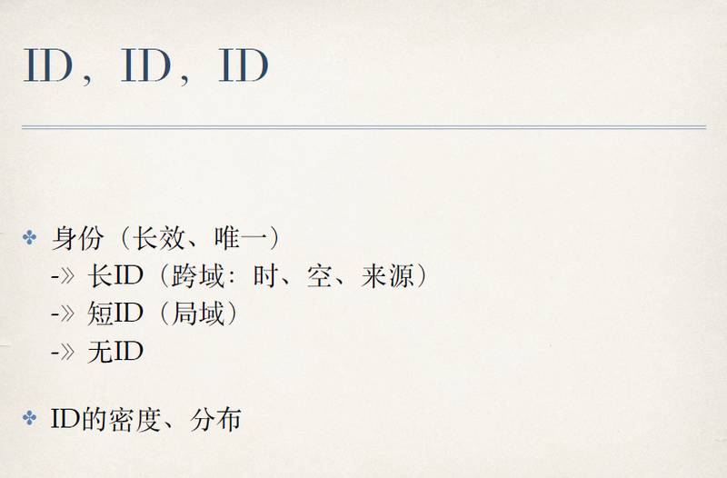 第二种就是长 ID,长 ID 是跨域的,跨时间、跨地点、跨来源,长 ID 并不能知道你是张三还是李四,但是它知道这个 ID 之前所有的活动。我们把能够拼接形成长 ID 的计算过程叫 ReID,就是你很多活动我们通过算法把它们连接在一起了。
