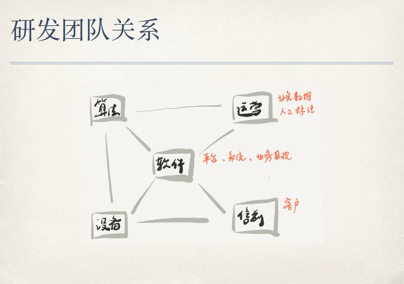 做一个 AI 的业务在研发团队里需要有这样一些角色,算法团队、软件团队、设备团队,更包括运营和售前。这些团队角色之间的关系,我简单讲一下。比如说算法团队和软件团队之间的关系,看起来很自然,算法团队提供算法,给软件团队来包装成产品。但实际上并不是这么直接,算法的结果一定是循序渐进的,开始得到的结果肯定不好。软件团队提供给用户的价值,是通过算法体现出来,但是算法还不够好的过程中,软件要当好一个背锅侠的角色,它需要通过各种手段来进行补助。算法不是万能的,软件在合适的时候巧妙的使用算法,才能实现算法最大的价值,不能美玉当砖。这些团队里,有不少故事可以讲,有机会我专门整理。