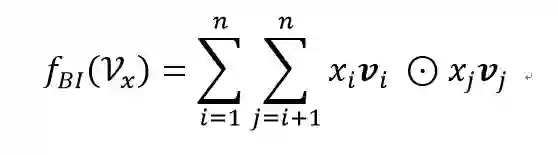 其中⊙表示两个向量按位相乘,例如 (v_i⊙v_j)_k= v_{ik} v_{jk}。该层的输出是一个k维向量,包含了隐空间内特征之间二阶的交互信息。