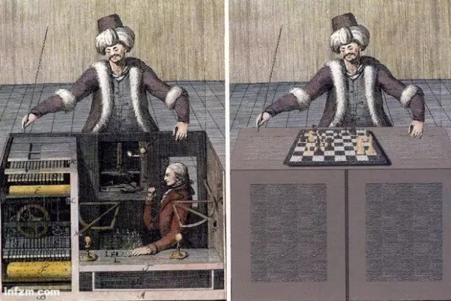 1769年,德国发明家兼外交家肯佩伦(Wolfgang von Kempelen)男爵准备造一台机械的下棋装置,一年后机器完工,取名“土耳其人”(The Turk),那时大家就把这玩意叫作“自动机”(automaton)。肯佩伦把这台机器展示给奥匈帝国的掌权者特蕾西娅(Maria Theresia,奥国女大公、匈国女王),于是它就成为娱乐欧洲各皇室的保留节目。称为“土耳其人”是因为这个装置的后面坐着一个土耳其装束的木头人。1804年,男爵死后,“土耳其人”被转卖给德国发明家兼娱乐人马泽尔(Johann Nepomuk Maelzel),1809年马泽尔把它展示给拿破仑,并和这位欧洲不可一世的征服者对弈一局。拿破仑执白棋先手,但最后“土耳其人”大胜,拿破仑恼羞成怒,把棋盘上的棋子全胡撸到地上。有好事者把拿破仑和“土耳其人”的对战棋谱记录在案,确实艺不如“机”。陆续和“土耳其人”接触过的名人还有富兰克林、爱伦坡和数学家巴贝奇。