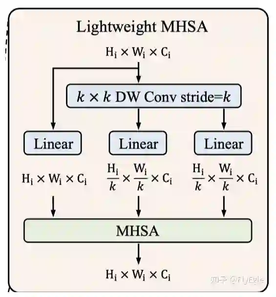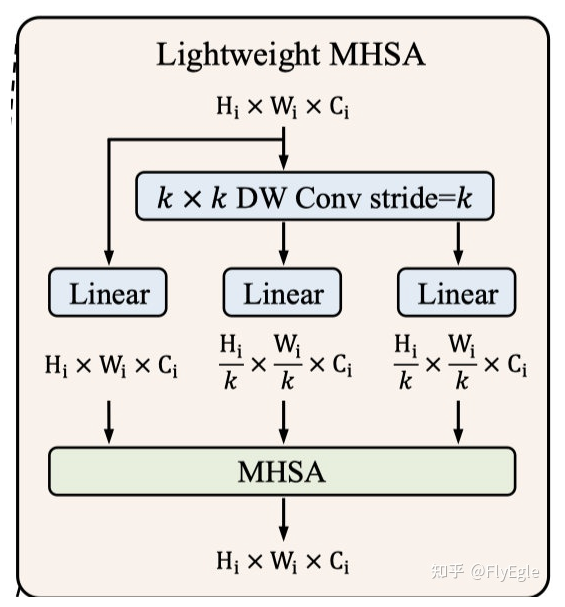 MHSA这个不用多说了,多头注意力,Lightweight这个作用,PVT 曾经有提出过,目的是为了降低复杂度,减少计算量。那本文是怎么做的呢,很简单,假设我们的输入为 , 对其分别做一个scale,使用卷积核为 ,stride为 的Depth Wise卷积来做了一次下采样,得到的shape为 ,那么对应的Q,K,V的shape分别为: