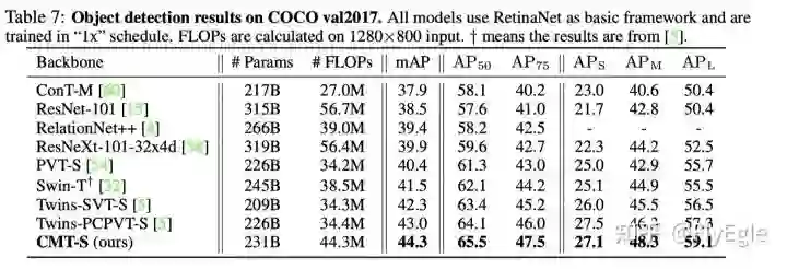 总体来说,CMT达到了更小的FLOPs同时有着不错的精度, imagenet上的结果如下: