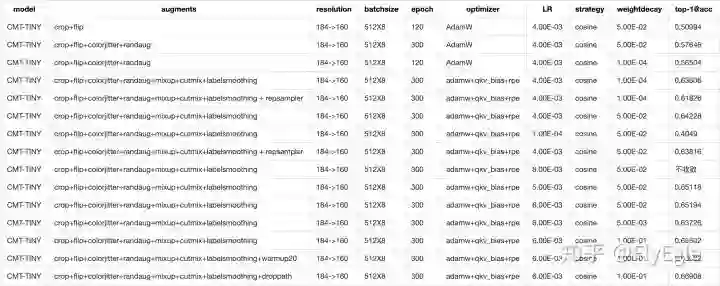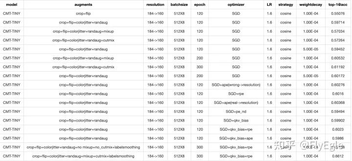 一方面想要看一下model是否是work的,一方面想要顺便验证一下DeiT的策略是否真的有效,所以从头开始做了很多的实验,简单整理如下: