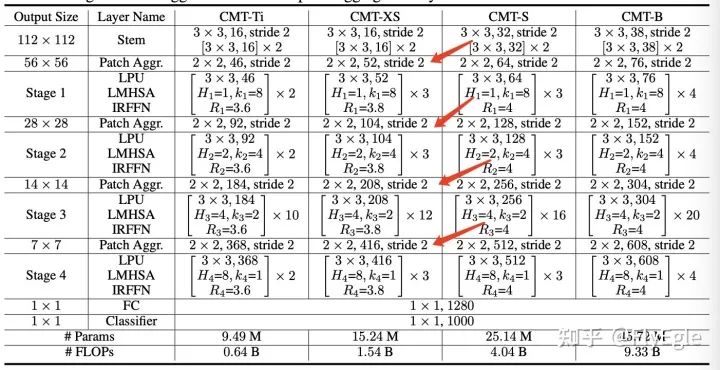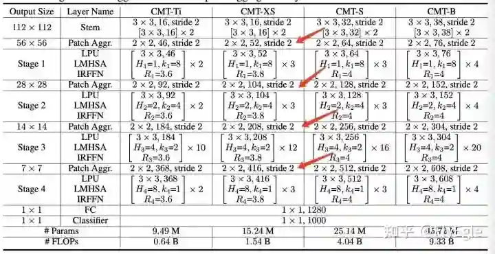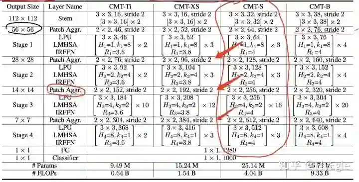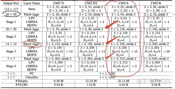 所以,整体的模型结构就一目了然了,假设输入为224x224x3,经过CMT-STEM和第一次下采样后,得到了一个56x56的featuremap,然后进入stage1,输出不变,经过下采样后,输入为28x28,进入stage2,输出后经过下采样,输入为14x14,进入stage3,输出后经过最后的下采样,输入为7x7,进入stage4,最后输出7x7的特征图,后面接avgpool和分类,达到分类的效果。