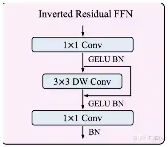 FFN的这个模块,其实和mbv2的block基本上就是一样的了,不一样的地方在于,使用的是GELU,采用的也是DW+PW来减少标准卷积的计算量。很简单,就不多说了,公式如下: