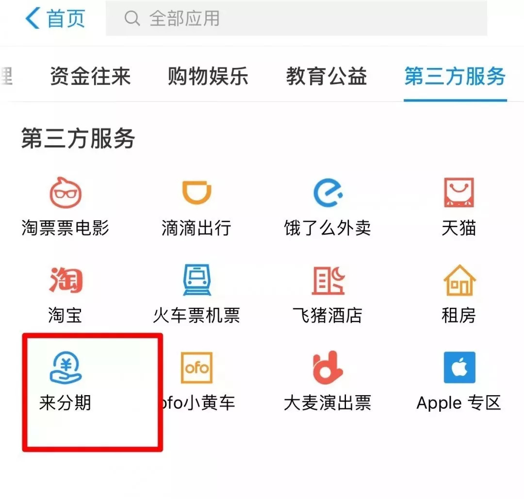 2015年9月,趣分期找到了它最重要的金主,得到了来自蚂蚁金服的2亿美元投资,并开了放支付宝、芝麻信用与其合作。此后,支付宝不仅在APP内提供趣分期入口,也向他们开放信用体系的接口。在支付宝的“第三方提供服务”入口,趣店以”来分期“占有了一席。