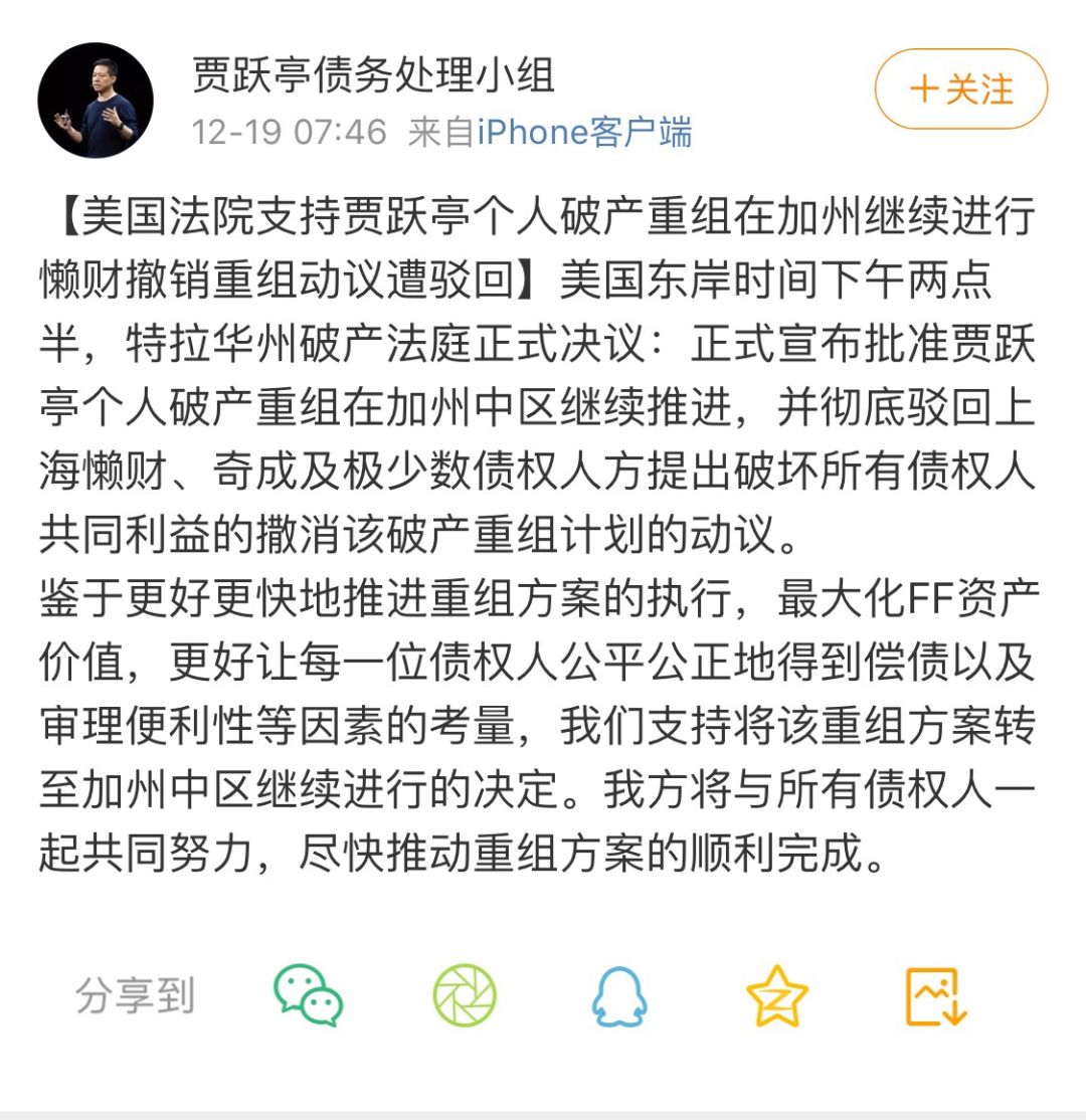 贾跃亭债务处理小组:美国法院支持贾跃亭个人破产重组在加州继续进行