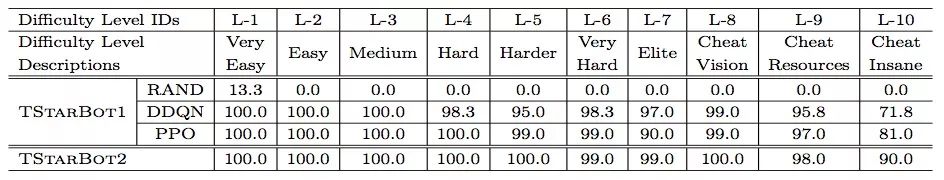 而TStarBot2的表现似乎更好,它和每个等级的机器人各进行了100场比赛,胜率取平均值(平局0.5)。数据结果显示了分层结构的有效性。