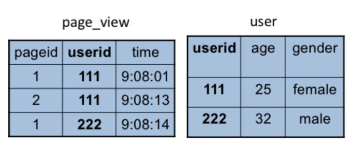 除了上面这些简单的聚合(group by)、过滤(where)操作,Hive还能执行连接(join on)操作。上面例子中,pv_users表的数据在实际中是无法直接得到的,因为pageid数据来自用户访问日志,每个用户进行一次页面浏览,就会生成一条访问记录,保存在page_view表中。而年龄age信息则记录在用户表user中。如下图:
