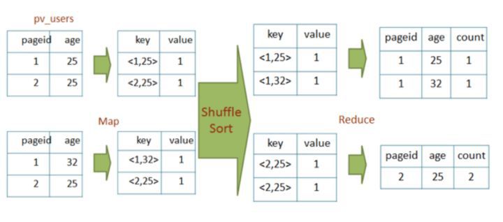 join的MapReduce计算过程和前面的group by稍有不同,因为join涉及两张表,来自两个文件(夹),所以需要在map输出的时候进行标记,比如来自第一张表的输出value就记录为<1, X>,这里的1表示数据来自第一张表。这样经过shuffle以后,相同的key被输入到同一个reduce函数,就可以根据表的标记对value数据求笛卡尔积,输出就join的结果。