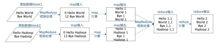 假设有两个block的文本数据需要进行词频统计,MapReduce计算过程如下图: