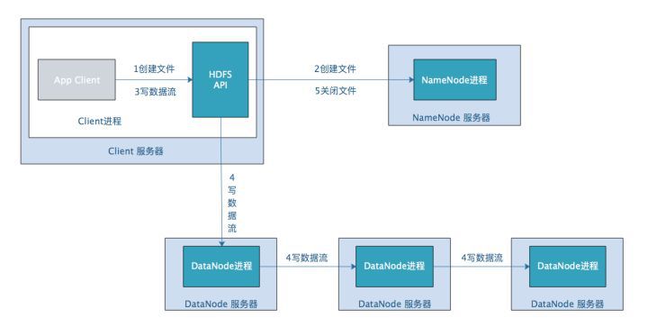 HDFS API连接第一个DataNode服务器,将Client数据流发送给DataNode,该DataNode一边将数据写入本地磁盘,一边发送给第二个DataNode,同理第二个DataNode记录数据并发送给第三个DataNode;