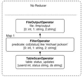 Hive内部预置了很多函数,Hive的执行计划就是根据SQL语句生成这些函数的DAG(有向无环图),然后封装进MapReduce的map和reduce函数中。这个例子中,map函数调用了三个Hive内置函数TableScanOpoerator、FilterOperator、FileOutputOperator,就完成了map计算,而且无需reduce函数。
