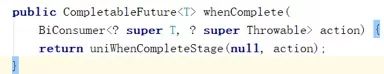 如果异步的编程模型基于 JDK8 的 CompletableFuture,可以通过 whenComplete 对返回值的异常进行非空判断,当异常非空时,进行异常逻辑处理,相关接口如下: