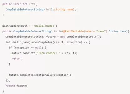服务端接口返回值为 CompletableFuture,这样采用透明 RPC 调用时就可以实现异步化。