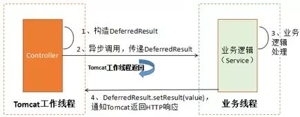 Controller 的返回值为 WebAsyncTask,实现 Callable, 在 call 方法中完成业务逻辑处理,由 SpringMVC 框架的线程池来异步执行业务逻辑(非 Tomcat 工作线程)。