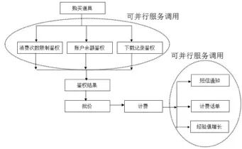 对于一些逻辑上不存在互相依赖关系的服务,可以通过异步 RPC 调用,实现服务的并行调用,通过并行调用来降低服务调用总耗时,以手游购买道具流程为例,消费次数限制鉴权、账户余额鉴权和下载记录鉴权三个服务可以通过异步的方式并行调用,来降低游戏道具购买的耗时:
