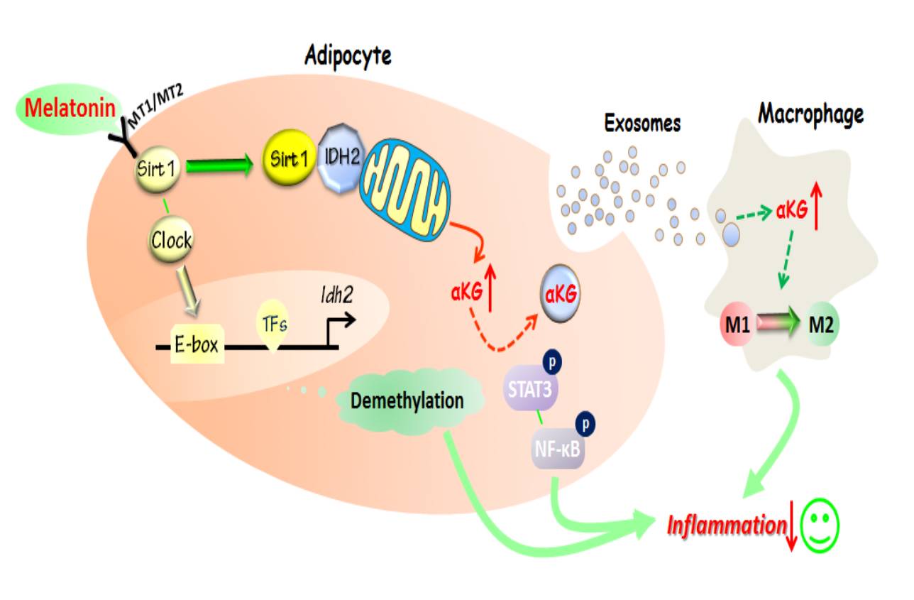 肥胖与巨噬细胞浸润和代谢性炎症有关,二者均促进代谢疾病的进展。据报道,褪黑素可通过抑制脂肪细胞炎症反应、激活巨噬细胞而发挥抗炎的特性。然而,在脂肪炎症期间,褪黑素在脂肪细胞和巨噬细胞之间的交流的作用仍不清楚。该研究证明了褪黑素可缓解肥胖小鼠脂肪组织中的炎症、促进α-酮戊二酸(αKG)水平升高。脂肪细胞线粒体中异柠檬酸脱氢酶2(Idh2)mRNA水平也被褪黑素升高,导致αKG水平增加。进一步分析显示αKG是褪黑素抑制脂肪炎症的靶标。此外,sirtuin 1(Sirt1)与IDH2物理相互作用并形成复合物以增加褪黑素抑制的脂肪炎症中Idh2和αKG含量的昼夜节律振幅。值得注意的是,褪黑素促进脂肪细胞的外泌体分泌、增加脂肪来源外泌体αKG的水平。该研究结果也证实,外泌体αKG转运到巨噬细胞后促进TET介导的DNA去甲基化,减轻了脂肪细胞炎症、增加了M2与M1巨噬细胞的比率。此外,外泌体αKG通过其受体oxoglutarate受体1(OXGR1)在脂肪细胞中减弱STAT3/NF-κB信号。褪黑素还减轻了慢性时差综合征小鼠的脂肪炎症和巨噬细胞数量。总之,这些结果表明褪黑素通过增加脂肪组织中的细胞和外泌体αKG水平来缓解代谢性炎症。数据揭示了褪黑素对脂肪细胞和巨噬细胞之间交流的新功能,提示褪黑素或能预防和治疗引起全身炎性疾病的肥胖症。
