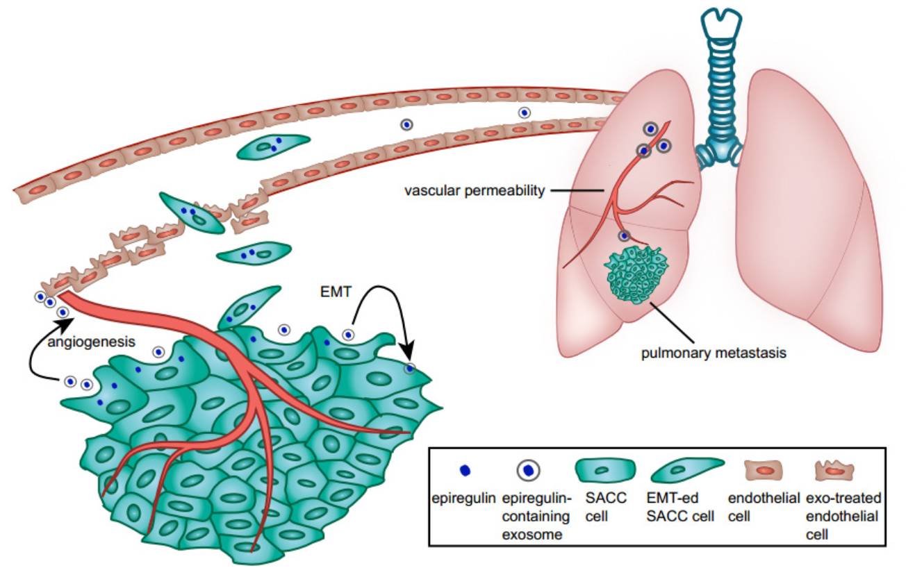 涎腺腺样囊性癌(SACC)是一种特殊的恶性肿瘤,其特点是生长缓慢但侵袭性强、肺转移发生率高、预后差。该研究揭示EGFR配体上皮调节蛋白(epiregulin)在SACC细胞亚群中的表达上调与SACC患者肺转移和不良结果相关。研究发现在SACC细胞中上调epiregulin可通过调节GLI1/E-钙粘蛋白诱导EMT。升高的epiregulin增加促血管生成因子的表达,如VEGFA、bFGF和IL-8。研究还显示epiregulin可以通过外泌体递送,并且epiregulin过表达的SACC细胞分泌的外泌体富含epiregulin。此外,用这些富含epiregulin的外泌体处理免疫缺陷小鼠极大地增强SACC向肺的转移。这些富含epiregulin的外泌体显著增强了邻近肿瘤微环境中的血管生成并且增加了体内转移前肺微环境中的血管通透性。因此,epiregulin以及含有epiregulin的外泌体可能是抑制SACC肺转移的新靶点。