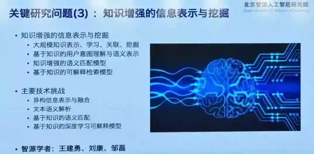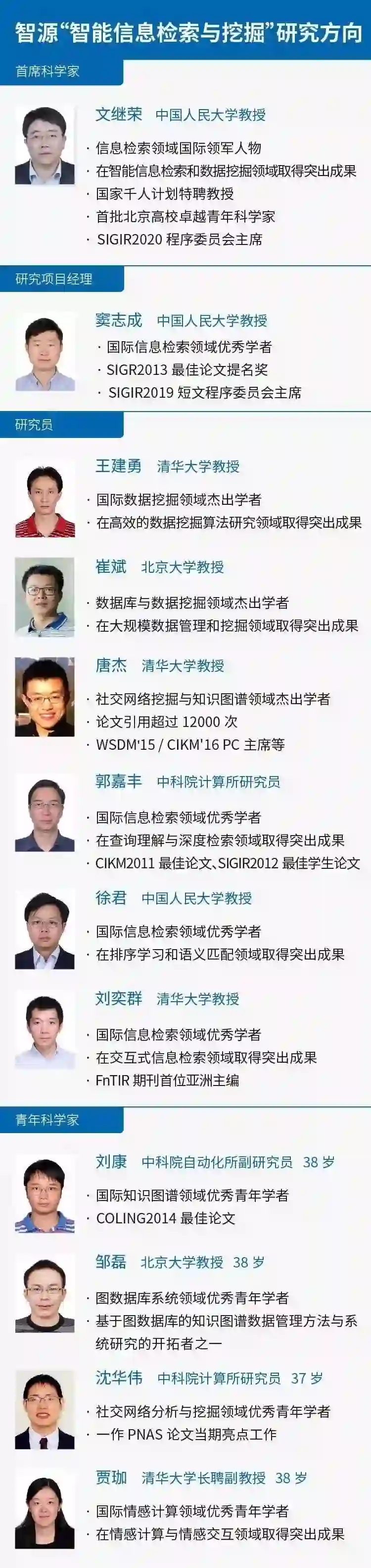 在今年8月份,北京智源人工智能研究院确立了第三个研究方向“智能信息检索与挖掘”,其中中国人民大学高瓴人工智能学院院长文继荣教授担任该重大方向的首席科学家,并由人民大学窦志成教授担任该方向的项目经理,清华大学王建勇、唐杰、刘奕群、贾珈,北京大学崔斌、邹磊,中科院郭嘉丰、刘康、沈华伟,人民大学徐君等担任该方向的智源学者。
