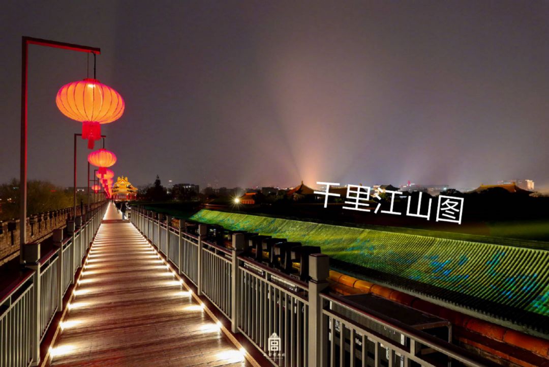 观众从午门进,步入点亮后的太和门广场,之后登午门城楼,沿着由红灯笼点缀的城墙步行至东南角楼,走过近千米长的故宫东城墙到达东北角楼,再步行至神武门,在这一区域,观众可以观赏到《千里江山图》《清明上河图》投映在金色琉璃瓦上,感受人在古代画卷中的氛围……