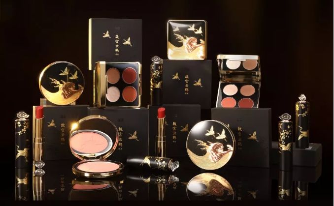 2018年,故宫推出了原创彩妆。下面这个就是故宫仙鹤系列产品,包括了眼影、腮红、口红等单品。"仙鹤飞于花间,也掠过山海,浮生万物,不如你"。